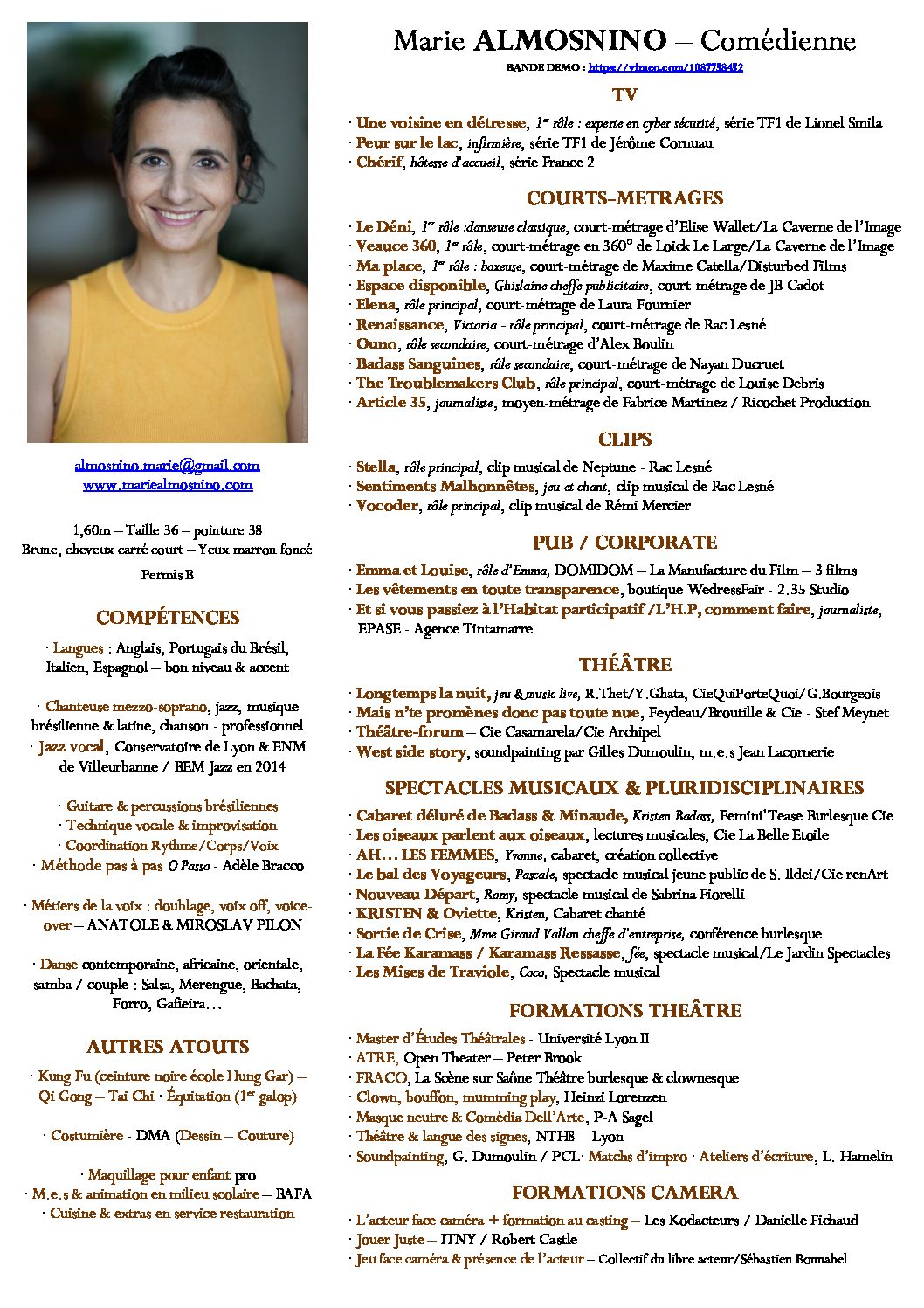 - Comédienne de théâtre, de théâtre musical et comédie musicale – formée en théâtre contemporain et théâtre burlesque et clownesque